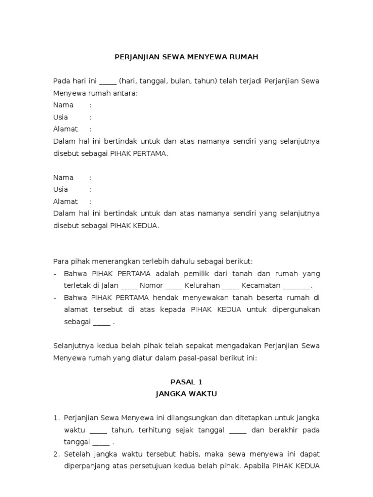 Surat perjanjian kontrak rumah dibuat secara tertulis bertujuan agar tidak terjadi hal yang tidak diinginkan di kemudian hari. Hal ini agar kekuatan hukum yang dimilikinya lebih besar, serta tidak dapat disangkal kebenarannya. Jika hanya mengandalkan lisan dan ingatan saja, maka suatu saat bisa saja lupa. Savesave surat perjanjian sewa menyewa rumah kantor.docx for later. Contoh surat tersebut juga bisa anda download dan print langsung.